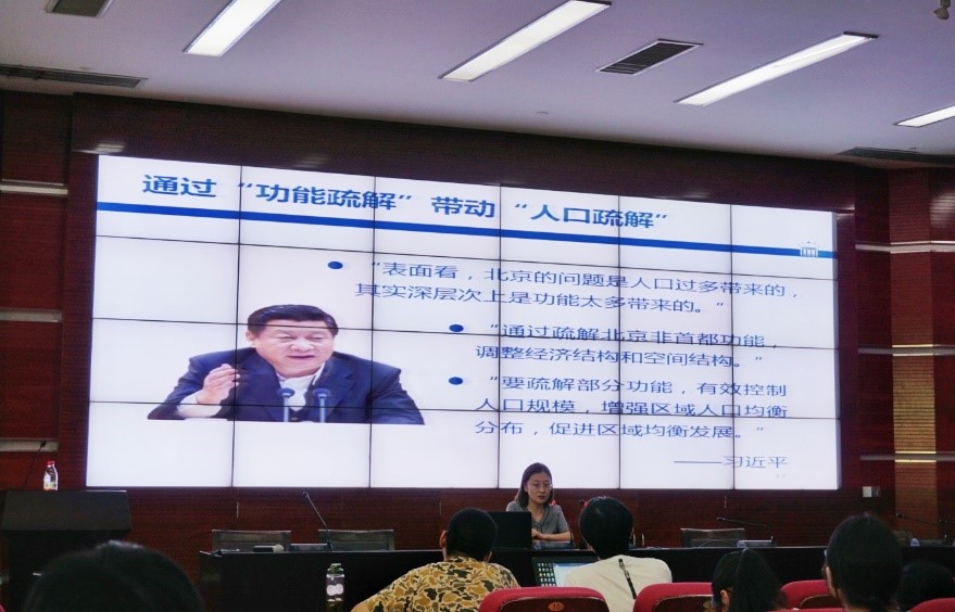 中共北京市委党校、北京行政学院经济学教研部副教授,兼任中国人民大学土地规划研究中心兼职研究员刁琳琳副教授为在座师生深入的剖析了“京津冀协同发展”道路及“有序疏解北京非首都功能”的新政策。刁琳琳副教授利用“京津冀一体化指数”作为讲座的切入点,通过“史上最难产的铁路——津保铁路”的例子引出了京津冀协同发展规划的重要性及迫切性。并从“京津冀协同发展之史与势”、“疏解非首都功能之难与易”、“协同发展与功能疏解之见与策”三个方面围绕着政策的维度、深度和高度进行了解读。讲座期间,刁琳琳副教授多次提及“京津冀协同发展与有序疏解北京非首都功能”为千年大计,要针对北京功能疏解的阶段性、特殊性、复杂性不断进行分析与反思,明确北京的非首都功能界限,正确定位作为疏解北京非首都功能集中承载区的雄安新区。