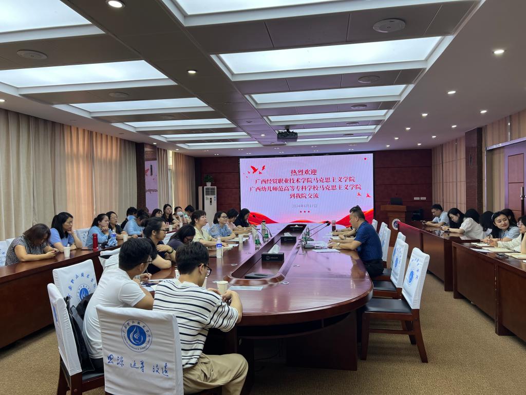6月17日下午3点,广西幼儿师范高等专科学校、广西经贸职业技术学院pp电子模拟网站一行31人到pp电子官网调研交流。pp电子模拟网站直属党支部书记、院长石乾福,副院长汪琦佳,教研室主任戴高蕙及部分思政课教师在春晖楼四楼会议室开展座谈会,会议由石乾福主持。