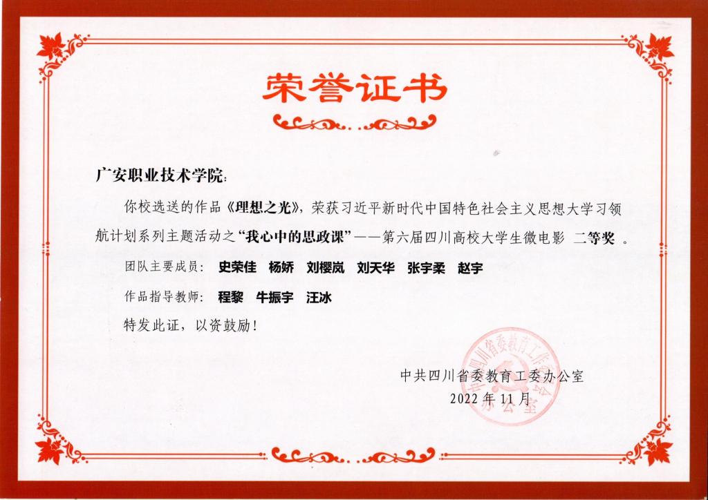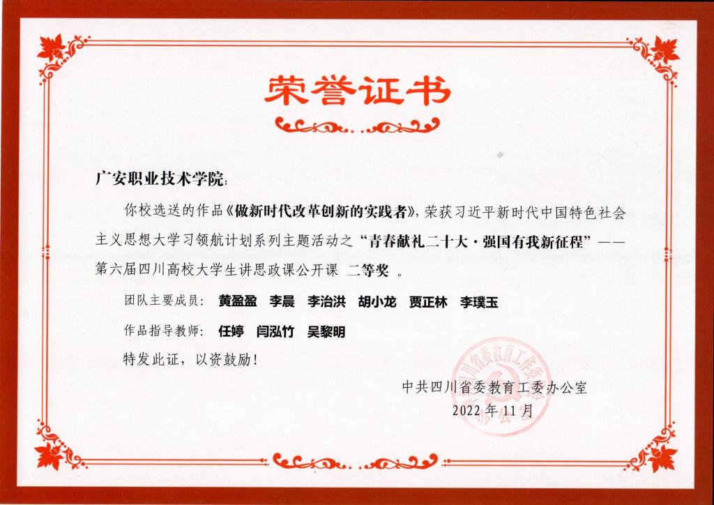 在以“青春献礼二十大 强国有我新征程”为主题的第六届四川高校大学生讲思政课公开课展示活动中,由程黎、牛振宇、吴建国团队指导学生将伟人故里红色资源深度融入党的十九届六中全会和习近平总书记重要讲话精神,创作《坚定走好必由之路 奋力书写时代华章》获全省高职高专组“一等奖”;任婷、闫泓竹、吴黎明团队指导学生创作的《做新时代改革创新的实践者》获全省高职高专组“二等奖”。在以“我心中的思政课”为主题的第六届四川高校大学生微电影展示活动中,由程黎、牛振宇、汪冰团队指导学生创作的微电影作品《理想之光》,获全省微电影比赛“二等奖”。获奖作品以其独特的方式呈现了用习近平新时代中国特色社会主义思想铸魂育人,增强了学生对思政课的获得感、体验感。
