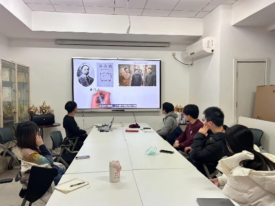 第二党小组组长张腾宇与小组党员与积极分子一道重温了毛主席在开国大典、抗美援朝等多个重要场合的讲话视频,带领同志们一起穿越历史,见证中国革命历史的重要时刻。大家一起学习青年时期的毛泽东同志自长沙求学到投身于革命事业的经历,研读《七律·到韶山》背后的革命精神,体会毛泽东同志高远的政治情怀、民族情怀、人民情怀。