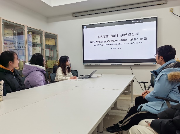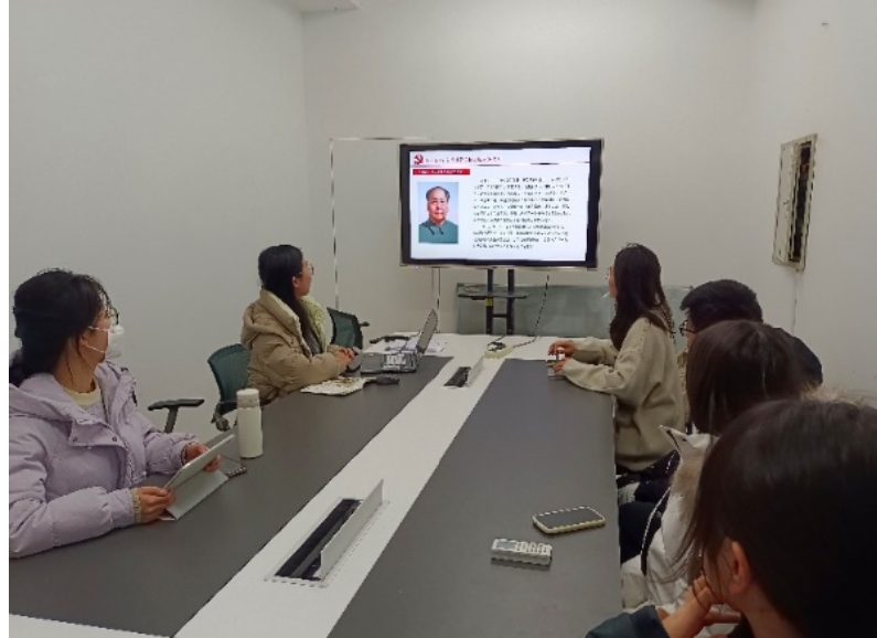 第四党小组组长黄纤玉带领小组党员和积极分子追忆主席往昔荣光,诵读主席文选,吟诵主席诗词,共同缅怀伟大领袖毛泽东同志。从集体歌唱歌曲《东方红》到观看主席纪录片,从诗词歌赋到原著原文,党员同志们讲述着他们心中的毛泽东,分享着他们感悟下的毛泽东思想。颜小曼同志就《毛泽东选集》第五卷社会主义改造——解决“五多”问题,从农业生产的重要性,到发现工作中存在的问题,到分析总结“五多”问题,再到最后的解决“五多”问题,逐层分析讨论。王一涵同志针对《毛泽东选集》第二卷的《共产党人》发刊词中统一战线、武装斗争和党的组织三者相互关系展开研学研讨。
