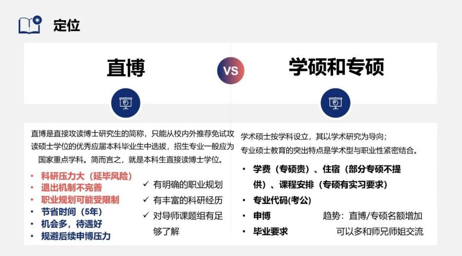 师姐详细地为同学们介绍了直博、学硕以及专硕的区别,并提到目前趋势显示,直博和专硕的名额逐渐增多,同学们可以根据自己的实际情况选择。